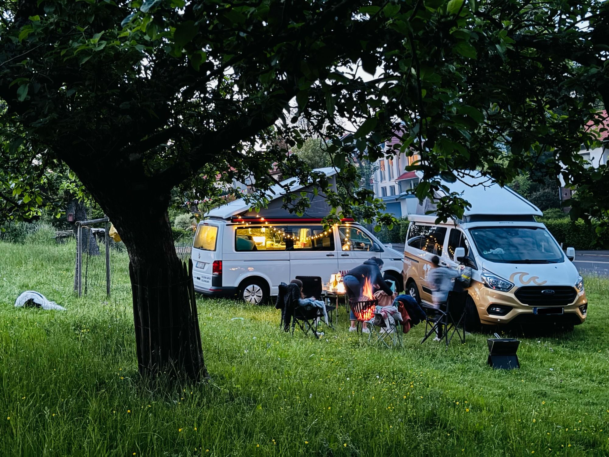 Ein WC mit Waschbecken ist gleich in der nahen Scheune, ca. 70m entfernt von der Wiese, und bei passender Witterung stellen wir Ihnen gerne eine Feuerschale und Feuerholz.